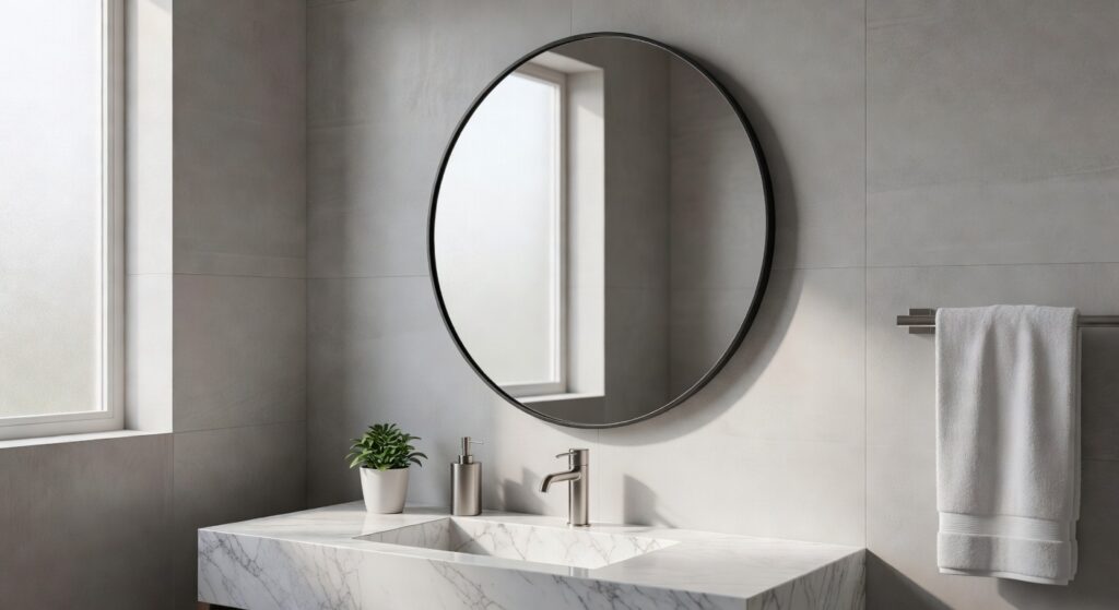 Ever notice how a smudged, flickering bathroom mirror turns a quick morning routine into a hassle? A matte‑black round mirror with a brushed‑aluminum frame hides fingerprints and resists rust, so you can trust it to stay pristine even in a high‑traffic vanity.