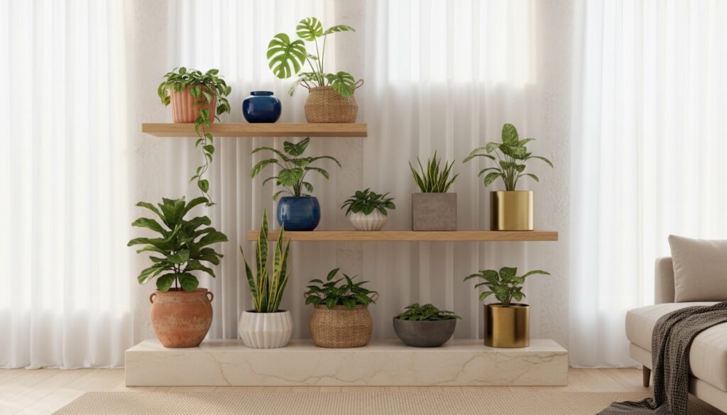 You’ll want small plants like succulents in 4-6 inch planters, medium houseplants in 8-10 inch pots, and large floor plants in 12+ inch containers. Always guarantee there’s 1-2 inches of growing room around roots.