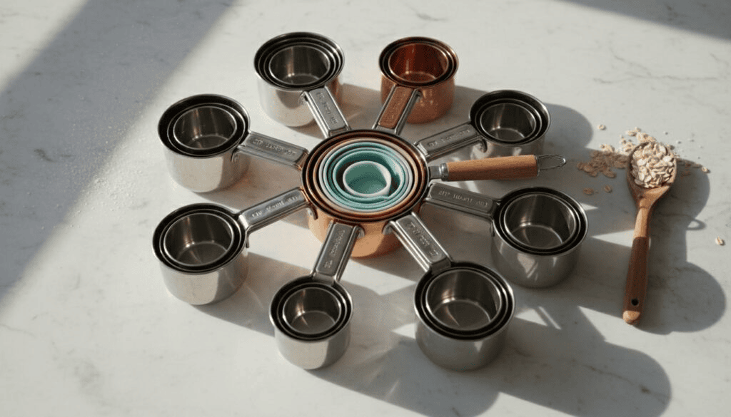 Standard measuring cup sets typically include four pieces (1 cup, ½ cup, ⅓ cup, and ¼ cup), but you’ll find options ranging from basic 4-piece sets to extensive 8-piece collections that add measurements like ⅔ cup, ¾ cup, ⅛ cup, and 2 cups. Consider your baking habits when selecting set size. If you’re frequently halving or doubling recipes, a ⅔ cup measure eliminates calculations. The ⅛ cup proves invaluable for spices and small ingredient quantities in professional-level baking.