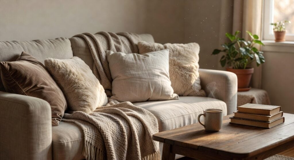 Match the pillow’s texture to the size of the piece and the room—think a chunky‑knit square on a big sectional, or a sleek velvet on a cozy loveseat. Pair a bold, ribbed pillow with a soft, smooth one for intentional contrast, and vary heights (like a 10‑inch tall pillow beside a 6‑inch flat) to keep the look lively yet balanced. Aim for the pillows to cover about a third to half the sofa’s width, mixing rough and smooth fabrics for a cohesive, stylish vibe.