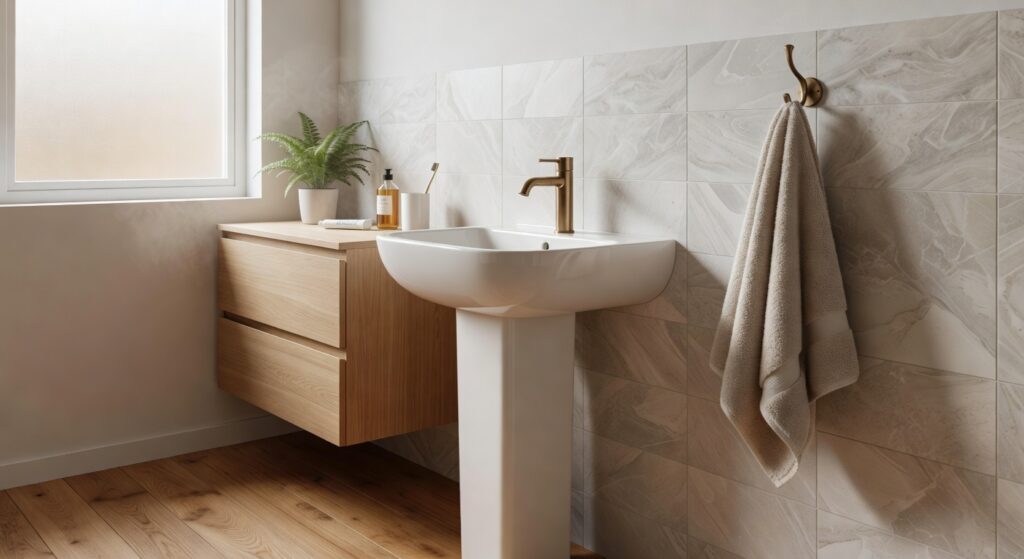 Before you buy, grab a tape and measure the vanity width, the distance from the wall to the tub edge, and the floor‑to‑backsplash height—pedestal sinks need a clear wall opening for plumbing. Aim for at least 30 inches of floor width and 20 inches of clearance from the back wall, plus a 12‑inch‑high wall opening for the pipe stack. This compact setup fits nicely in bathrooms under 5 ft × 8 ft, perfect for busy households that need space‑saving solutions.