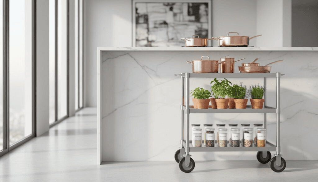 Don’t overlook vertical clearances when selecting your cart. Measure doorways, cabinet clearances, and ceiling heights, especially if considering taller units. Verify that your chosen cart can fit through your kitchen entrance and navigate corners without difficulty, accounting for both its stationary footprint and the clearance needed when moving it.