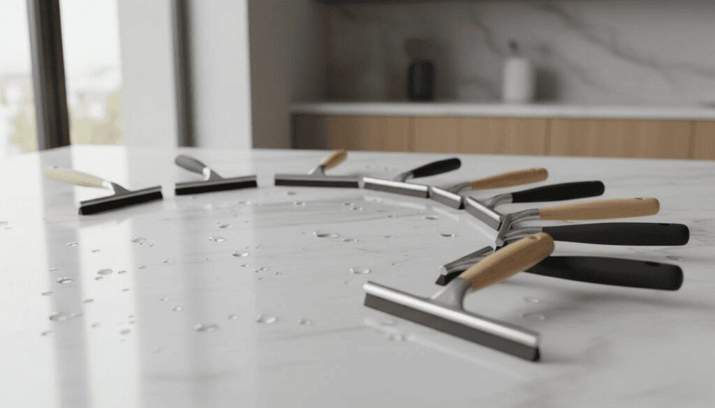 - Dual-function squeegees like KOHLER combine stainless steel blades with nylon bristles for handling both wet spills and dry crumbs effectively.