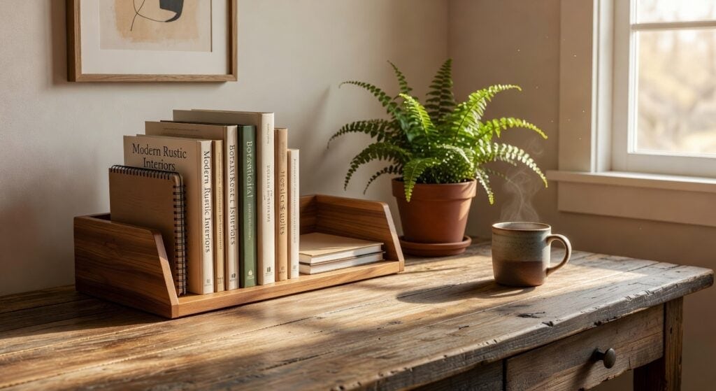 Pick a desk organizer that matches your space’s vibe—rustic oak for a cozy home office with brick, or matte‑black walnut for a sleek, minimalist look. Choose a finish that highlights the wood grain for warmth or a stained coat that hides blemishes and ties into your color scheme, like matte walnut with gray walls and metal accents. Make sure it fits your desk, about 8 inches wide for a small surface and up to 12 inches for a larger tabletop, so it feels balanced without taking over.