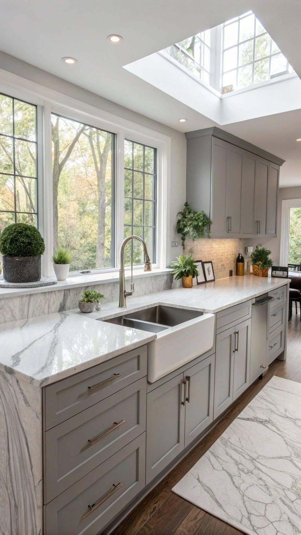 - Warm champagne brass pulls that make your gray cabinets feel like they’re wearing jewelry