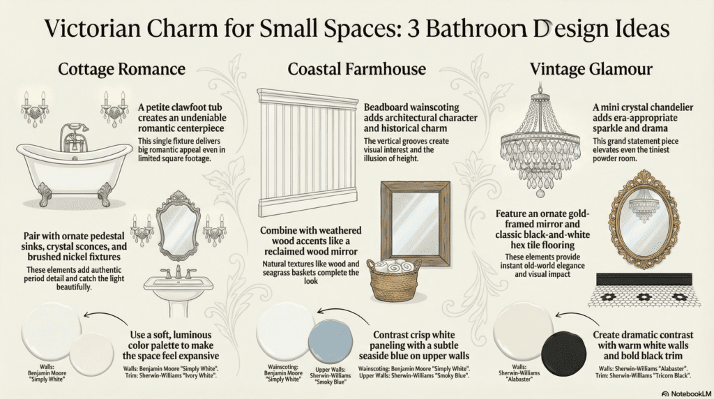 There’s something undeniably magical about stepping into a small bathroom where vintage charm meets everyday comfort. Imagine creamy white porcelain gleaming against soft ivory walls, while brushed nickel fixtures catch the light and aged wood accents add warmth underfoot. This cottage-inspired Victorian retreat proves that limited square footage can still deliver big romantic appeal with the right period details.